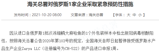 因从进口自俄罗斯1批次冻细鳞大麻哈鱼的1个外包装样本中检出新冠病毒核酸阳性,按照海关总署公告2020年第103号的规定,全国海关自即日起暂停接受俄罗斯水产品生产企业Zarya LLC(注册编号为CH-522)的产品进口申报1周。