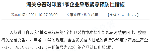 因从进口自印度1批次冻鱿鱼的1个外包装样本中检出新冠病毒核酸阳性,按照海关总署公告2020年第103号的规定,全国海关自即日起暂停接受印度水产品生产企业M/s. AQUA GENO EXIM(注册编号为720)的产品进口申报1周。