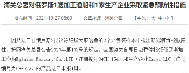 因从进口自俄罗斯2批次冻细鳞大麻哈鱼的2个外包装样本中检出新冠病毒核酸阳性,按照海关总署公告2020年第103号的规定,全国海关自即日起暂停接受俄罗斯加工渔船Eglaine Mercury Co.,LTD(注册编号为CH-154)和生产企业Zarya LLC(注册编号为CH-522)的产品进口申报1周。