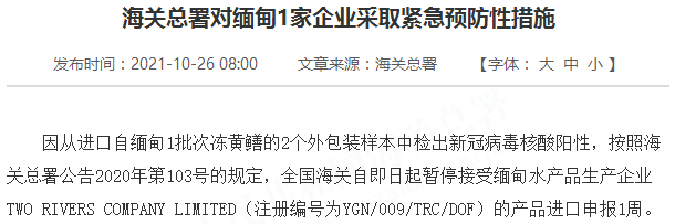 因从进口自缅甸1批次冻黄鳝的2个外包装样本中检出新冠病毒核酸阳性,按照海关总署公告2020年第103号的规定,全国海关自即日起暂停接受缅甸水产品生产企业TWO RIVERS COMPANY LIMITED(注册编号为YGN/009/TRC/DOF)的产品进口申报1周。