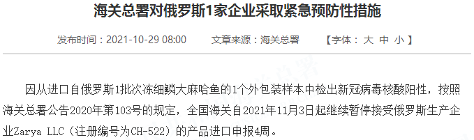 因从进口自俄罗斯1批次冻细鳞大麻哈鱼的1个外包装样本中检出新冠病毒核酸阳性,按照海关总署公告2020年第103号的规定,全国海关自2021年11月3日起继续暂停接受俄罗斯生产企业Zarya LLC(注册编号为CH-522)的产品进口申报4周。
