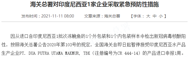 因从进口自印度尼西亚1批次冻鮸鱼的1个外包装和1个内包装样本中检出新冠病毒核酸阳性,按照海关总署公告2020年第103号的规定,全国海关自即日起暂停接受印度尼西亚水产品生产企业PT. DUA PUTRA UTAMA MAKMUR, TBK(注册编号为CR 444-14)的产品进口申报1周。
