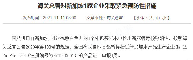 因从进口自新加坡1批次冻熟白鱼丸的1个外包装样本中检出新冠病毒核酸阳性,按照海关总署公告2020年第103号的规定,全国海关自即日起暂停接受新加坡水产品生产企业Ha Li Fa Pte Ltd(注册编号为NY12G0001)的产品进口申报1周。