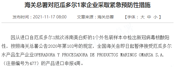 因从进口自厄瓜多尔1批次冻南美白虾的1个外包装样本中检出新冠病毒核酸阳性,按照海关总署公告2020年第103号的规定,全国海关自即日起暂停接受厄瓜多尔水产品生产企业OPERADORA Y PROCESADORA DE PRODUCTOS MARINOS OMARSA S.A.(注册编号为477)的产品进口申报4周。