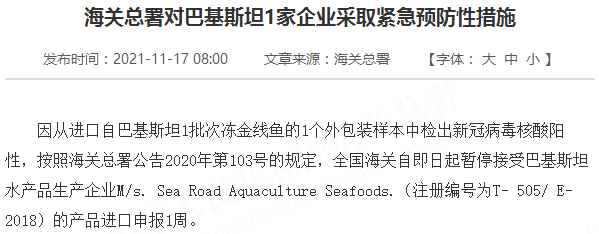海关总署对巴基斯坦厄瓜多尔的各1家企业采取紧急预防性措施