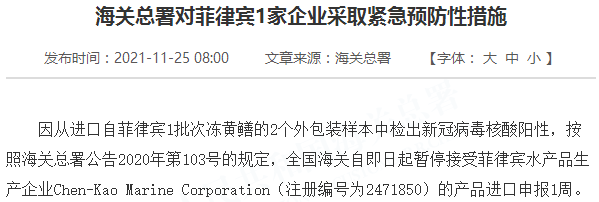 因从进口自菲律宾1批次冻黄鳝的2个外包装样本中检出新冠病毒核酸阳性,按照海关总署公告2020年第103号的规定,全国海关自即日起暂停接受菲律宾水产品生产企业Chen-Kao Marine Corporation(注册编号为2471850)的产品进口申报1周。