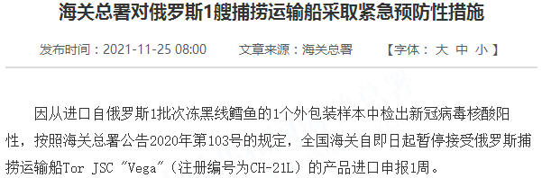因从进口自俄罗斯1批次冻黑线鳕鱼的1个外包装样本中检出新冠病毒核酸阳性,按照海关总署公告2020年第103号的规定,全国海关自即日起暂停接受俄罗斯捕捞运输船Tor JSC "Vega"(注册编号为CH-21L)的产品进口申报1周。