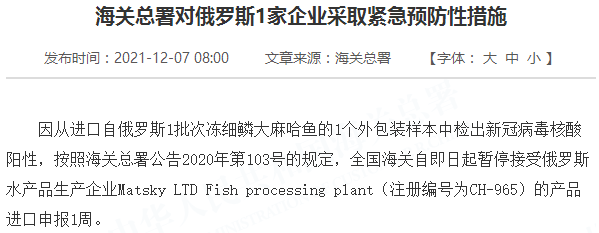 因从进口自俄罗斯1批次冻细鳞大麻哈鱼的1个外包装样本中检出新冠病毒核酸阳性,按照海关总署公告2020年第103号的规定,全国海关自即日起暂停接受俄罗斯水产品生产企业Matsky LTD Fish processing plant(注册编号为CH-965)的产品进口申报1周。