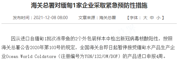 因从进口自缅甸1批次冻带鱼的2个外包装样本中检出新冠病毒核酸阳性,按照海关总署公告2020年第103号的规定,全国海关自即日起暂停接受缅甸水产品生产企业Ocean World Coldstore(注册编号为YGN/132/OW/DOF)的产品进口申报4周。