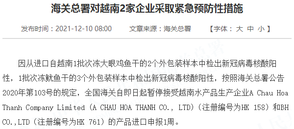 因从进口自越南1批次冻大眼鸡鱼干的2个外包装样本中检出新冠病毒核酸阳性,1批次冻鱿鱼干的3个外包装样本中检出新冠病毒核酸阳性,按照海关总署公告2020年第103号的规定,全国海关自即日起暂停接受越南水产品生产企业A Chau Hoa Thanh Company Limited (A CHAU HOA THANH CO., LTD)(注册编号为HK 158)和BH CO.,LTD(注册编号为HK 761)的产品进口申报1周。