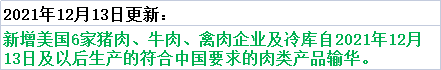 ⬆ 新增美国6家猪肉、牛肉、禽肉企业及冷库自2021年12月13日及以后生产的符合中国要求的肉类产品输华。