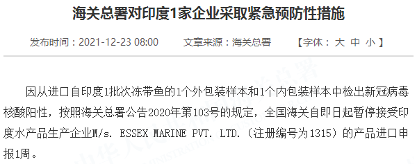 因从进口自印度1批次冻带鱼的1个外包装样本和1个内包装样本中检出新冠病毒核酸阳性,按照海关总署公告2020年第103号的规定,全国海关自即日起暂停接受印度水产品生产企业M/s. ESSEX MARINE PVT. LTD.(注册编号为1315)的产品进口申报1周。