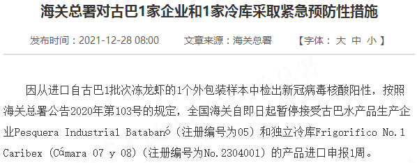 海关总署 | 对古巴1家企业和1家冷库采取紧急预防性措施