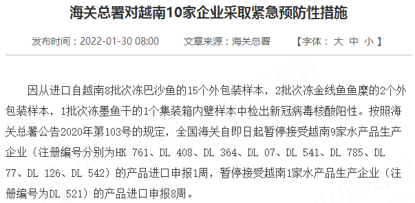 因从进口自越南8批次冻巴沙鱼的15个外包装样本,2批次冻金线鱼鱼糜的2个外包装样本,1批次冻墨鱼干的1个集装箱内壁样本中检出新冠病毒核酸阳性。按照海关总署公告2020年第103号的规定,全国海关自即日起暂停接受越南9家水产品生产企业(注册编号分别为HK 761、DL 408、DL 364、DL 07、DL 541、DL 785、DL 77、DL 126、DL 542)的产品进口申报1周,暂停接受越南1家水产品生产企业(注册编号为DL 521)的产品进口申报8周。