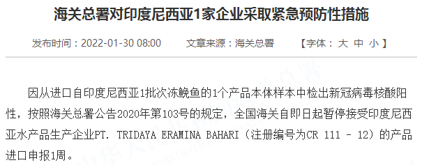 因从进口自印度尼西亚1批次冻鮸鱼的1个产品本体样本中检出新冠病毒核酸阳性,按照海关总署公告2020年第103号的规定,全国海关自即日起暂停接受印度尼西亚水产品生产企业PT. TRIDAYA ERAMINA BAHARI(注册编号为CR 111 - 12)的产品进口申报1周。