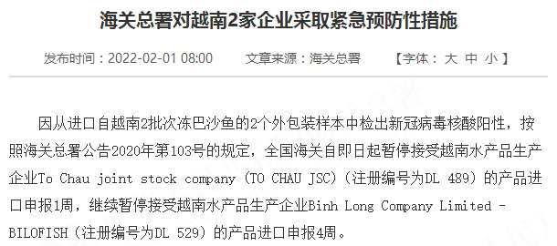 因从进口自越南2批次冻巴沙鱼的2个外包装样本中检出新冠病毒核酸阳性,按照海关总署公告2020年第103号的规定,全国海关自即日起暂停接受越南水产品生产企业To Chau joint stock company (TO CHAU JSC)(注册编号为DL 489)的产品进口申报1周,继续暂停接受越南水产品生产企业Binh Long Company Limited - BILOFISH(注册编号为DL 529)的产品进口申报4周。