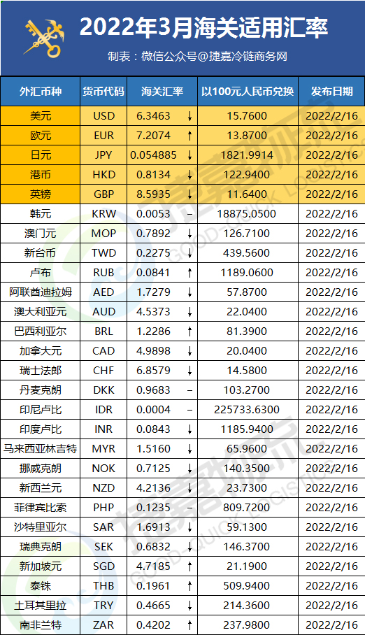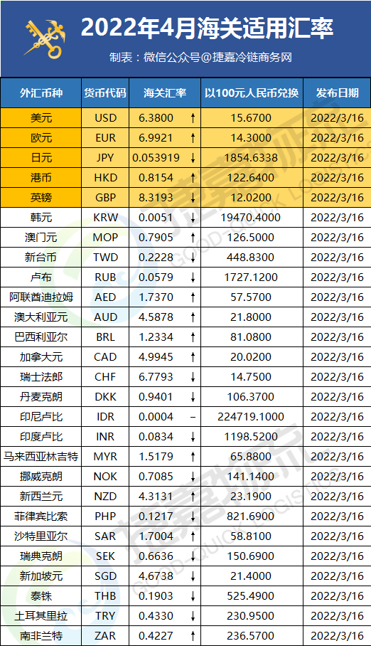捷嘉关注 | 2022年4月海关适用汇率