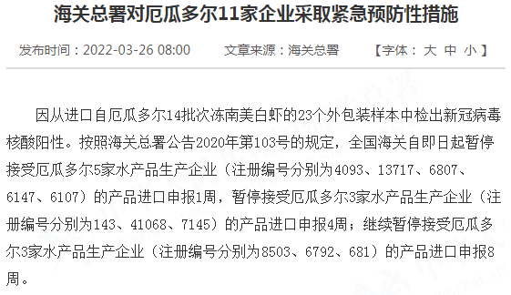 因从进口自厄瓜多尔14批次冻南美白虾的23个外包装样本中检出新冠病毒核酸阳性。按照海关总署公告2020年第103号的规定,全国海关自即日起暂停接受厄瓜多尔5家水产品生产企业(注册编号分别为4093、13717、6807、6147、6107)的产品进口申报1周,暂停接受厄瓜多尔3家水产品生产企业(注册编号分别为143、41068、7145)的产品进口申报4周;继续暂停接受厄瓜多尔3家水产品生产企业(注册编号分别为8503、6792、681)的产品进口申报8周。