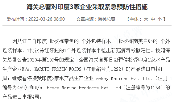 因从进口自印度1批次冻带鱼的1个外包装样本,1批次冻南美白虾的1个外包装样本,1批次冻红牙䱛的1个外包装样本中检出新冠病毒核酸阳性。按照海关总署公告2020年第103号的规定,全国海关自即日起暂停接受印度1家水产品生产企业M/s. MARUTI FROZEN FOODS(注册编号为1222)的产品进口申报1周;继续暂停接受印度2家水产品生产企业Teekay Marines Pvt. Ltd.(注册编号为459)和M/s. Pesca Marine Products Pvt. Ltd(注册编号为1164)的产品进口申报4周。