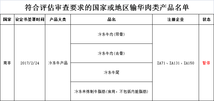 暂停南非自2022年4月1日(含)起启运的牛肉产品输华。