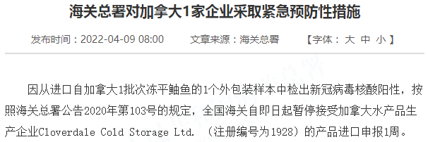 因从进口自加拿大1批次冻平鲉鱼的1个外包装样本中检出新冠病毒核酸阳性,按照海关总署公告2020年第103号的规定,全国海关自即日起暂停接受加拿大水产品生产企业Cloverdale Cold Storage Ltd. (注册编号为1928)的产品进口申报1周。