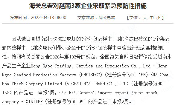 因从进口自越南2批次冻黑虎虾的3个外包装样本,1批次冻巴沙鱼的1个集装箱内壁样本,1批次康氏侧带小公鱼干的1个外包装样本中检出新冠病毒核酸阳性。按照海关总署公告2020年第103号的规定,全国海关自即日起暂停接受越南水产品生产企业Hong Ngoc Trading, Service and Production Co., Ltd - Hong Ngoc Seafood Production Factory (HNFISHCO)(注册编号为DL 155)和A Chau Hoa Thanh Company Limited (A CHAU HOA THANH CO., LTD)(注册编号为HK 158)的产品进口申报1周,Gia Rai General import export joint stock company - GIRIMEX(注册编号为DL 99)的产品进口申报2周。