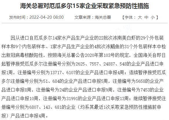 因从进口自厄瓜多尔14家水产品生产企业的22批次冻南美白虾的29个外包装样本和9个内包装样本、1家水产品生产企业的4批次冻鲳鱼的31个外包装样本中检出新冠病毒核酸阳性,按照海关总署公告2020年第103号的规定,全国海关自即日起暂停接受厄瓜多尔注册编号分别为2625、7557、24887、548的企业产品进口申报1周,注册编号分别为13717、6107的企业产品进口申报4周;连续暂停接受厄瓜多尔注册编号分别为51、684的企业产品进口申报5周,注册编号为5658的企业产品进口申报8周,注册编号为24的企业产品进口申报9周,注册编号为7453的企业产品进口申报10周,注册编号为31991的企业产品进口申报13周;继续暂停接受注册编号分别为6807、143、681的企业(均系其最近1次采取紧急预防性措施前申报)产品进口申报4周。