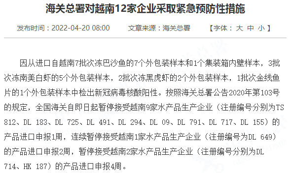 因从进口自越南7批次冻巴沙鱼的7个外包装样本和1个集装箱内壁样本,3批次冻南美白虾的5个外包装样本,2批次冻黑虎虾的2个外包装样本,1批次金线鱼片的1个外包装样本中检出新冠病毒核酸阳性。按照海关总署公告2020年第103号的规定,全国海关自即日起暂停接受越南9家水产品生产企业(注册编号分别为TS 812、DL 183、DL 725、DL 491、DL 294、DL 09、DL 791、DL 717、DL 155)的产品进口申报1周,连续暂停接受越南1家水产品生产企业(注册编号为DL 649)的产品进口申报2周,暂停接受越南2家水产品生产企业(注册编号分别为DL 714、HK 187)的产品进口申报4周。