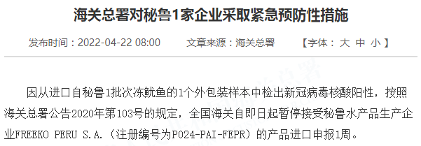 因从进口自秘鲁1批次冻鱿鱼的1个外包装样本中检出新冠病毒核酸阳性,按照海关总署公告2020年第103号的规定,全国海关自即日起暂停接受秘鲁水产品生产企业FREEKO PERU S.A.(注册编号为P024-PAI-FEPR)的产品进口申报1周。