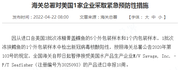 因从进口自美国3批次冻糙黄盖鲽鱼的5个外包装样本和1个内包装样本,1批次冻狭鳕鱼的1个外包装样本中检出新冠病毒核酸阳性,按照海关总署公告2020年第103号的规定,全国海关自即日起暂停接受美国水产品生产企业M/V Savage, Inc. - F/T Seafisher(注册编号为3025093)的产品进口申报10周。