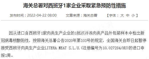 因从进口自西班牙1家肉类生产企业的1批次冷冻肉类产品外包装样本中检出新冠病毒核酸阳性,按照海关总署公告2020年第103号的规定,全国海关自即日起暂停接受西班牙肉类生产企业LITERA MEAT S.L.U.(注册编号为10.027284/HU)的进口申报1周。