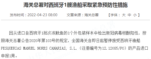 因从进口自西班牙1批次冻鱿鱼的1个外包装样本中检出新冠病毒核酸阳性,按照海关总署公告2020年第103号的规定,全国海关自即日起暂停接受西班牙渔船PESQUERIAS MANUEL NORES CANARIAS, S.L.(注册编号为12.12085/PO)的产品进口申报1周。