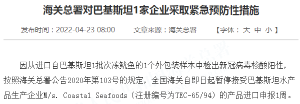 因从进口自巴基斯坦1批次冻鱿鱼的1个外包装样本中检出新冠病毒核酸阳性,按照海关总署公告2020年第103号的规定,全国海关自即日起暂停接受巴基斯坦水产品生产企业M/s. Coastal Seafoods(注册编号为TEC-65/94)的产品进口申报1周。