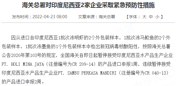 因从进口自印度尼西亚1批次冻明虾的2个外包装样本,1批次冻马鲛鱼的2个外包装样本,1批次冻墨鱼的1个外包装样本中检出新冠病毒核酸阳性,按照海关总署公告2020年第103号的规定,全国海关自即日起暂停接受印度尼西亚水产品生产企业PT. HOLI MINA JAYA(注册编号为CR 209-14)的产品进口申报1周,连续暂停接受印度尼西亚水产品生产企业PT. SAMBU PERKASA MANDIRI(注册编号为CR 040-13)的产品进口申报2周。