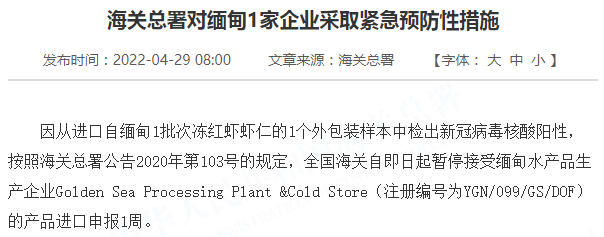 因从进口自缅甸1批次冻红虾虾仁的1个外包装样本中检出新冠病毒核酸阳性,按照海关总署公告2020年第103号的规定,全国海关自即日起暂停接受缅甸水产品生产企业Golden Sea Processing Plant &Cold Store(注册编号为YGN/099/GS/DOF)的产品进口申报1周。