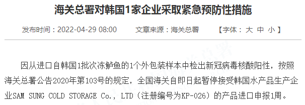 因从进口自韩国1批次冻鲈鱼的1个外包装样本中检出新冠病毒核酸阳性,按照海关总署公告2020年第103号的规定,全国海关自即日起暂停接受韩国水产品生产企业SAM SUNG COLD STORAGE Co., LTD(注册编号为KP-026)的产品进口申报1周。