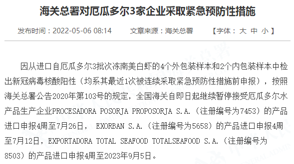 因从进口自厄瓜多尔3批次冻南美白虾的4个外包装样本和2个内包装样本中检出新冠病毒核酸阳性(均系其最近1次被连续采取紧急预防性措施前申报),按照海关总署公告2020年第103号的规定,全国海关自即日起继续暂停接受厄瓜多尔水产品生产企业PROCESADORA POSORJA PROPOSORJA S.A.(注册编号为7453)的产品进口申报4周至7月26日, EXORBAN S.A.(注册编号为5658)的产品进口申报4周至7月12日,EXPORTADORA TOTAL SEAFOOD TOTALSEAFOOD S.A.(注册编号为8503)的产品进口申报4周至2023年9月5日。