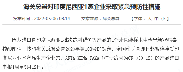 因从进口自印度尼西亚1批次冻刺鲳鱼等产品的1个外包装样本中检出新冠病毒核酸阳性,按照海关总署公告2020年第103号的规定,全国海关自即日起暂停接受印度尼西亚水产品生产企业PT. ARTA MINA TAMA(注册编号为CR 030-12)的产品进口申报1周至5月12日。