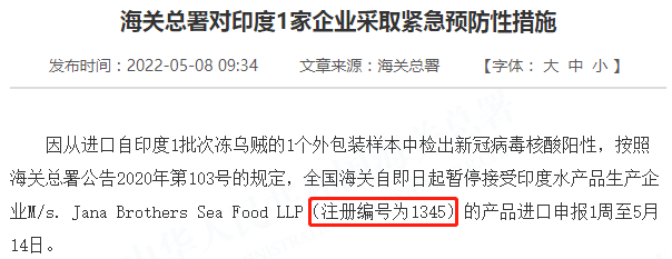 因从进口自印度1批次冻乌贼的1个外包装样本中检出新冠病毒核酸阳性,按照海关总署公告2020年第103号的规定,全国海关自即日起暂停接受印度水产品生产企业M/s. Jana Brothers Sea Food LLP(注册编号为1345)的产品进口申报1周至5月14日。