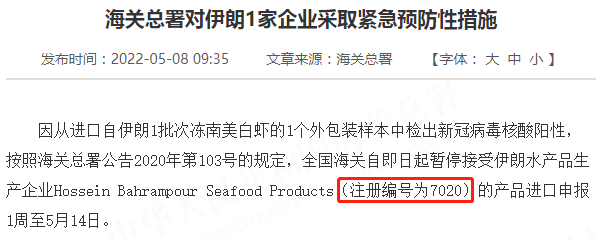 因从进口自伊朗1批次冻南美白虾的1个外包装样本中检出新冠病毒核酸阳性,按照海关总署公告2020年第103号的规定,全国海关自即日起暂停接受伊朗水产品生产企业Hossein Bahrampour Seafood Products(注册编号为7020)的产品进口申报1周至5月14日。
