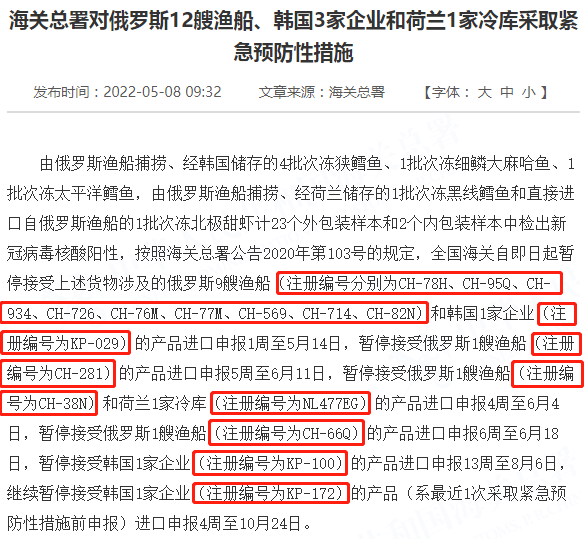 由俄罗斯渔船捕捞、经韩国储存的4批次冻狭鳕鱼、1批次冻细鳞大麻哈鱼、1批次冻太平洋鳕鱼,由俄罗斯渔船捕捞、经荷兰储存的1批次冻黑线鳕鱼和直接进口自俄罗斯渔船的1批次冻北极甜虾计23个外包装样本和2个内包装样本中检出新冠病毒核酸阳性,按照海关总署公告2020年第103号的规定,全国海关自即日起暂停接受上述货物涉及的俄罗斯9艘渔船(注册编号分别为CH-78H、CH-95Q、CH-934、CH-726、CH-76M、CH-77M、CH-569、CH-714、CH-82N)和韩国1家企业(注册编号为KP-029)的产品进口申报1周至5月14日,暂停接受俄罗斯1艘渔船(注册编号为CH-281)的产品进口申报5周至6月11日,暂停接受俄罗斯1艘渔船(注册编号为CH-38N)和荷兰1家冷库(注册编号为NL477EG)的产品进口申报4周至6月4日,暂停接受俄罗斯1艘渔船(注册编号为CH-66Q)的产品进口申报6周至6月18日,暂停接受韩国1家企业(注册编号为KP-100)的产品进口申报13周至8月6日,继续暂停接受韩国1家企业(注册编号为KP-172)的产品(系最近1次采取紧急预防性措施前申报)进口申报4周至10月24日。