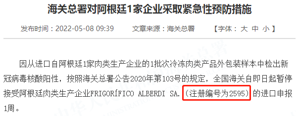 因从进口自阿根廷1家肉类生产企业的1批次冷冻肉类产品外包装样本中检出新冠病毒核酸阳性,按照海关总署公告2020年第103号的规定,全国海关自即日起暂停接受阿根廷肉类生产企业FRIGORÍFICO ALBERDI SA.(注册编号为2595)的进口申报1周。