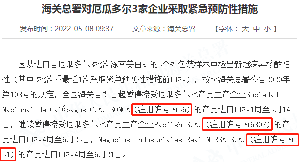 因从进口自厄瓜多尔3批次冻南美白虾的5个外包装样本中检出新冠病毒核酸阳性(其中2批次系最近1次采取紧急预防性措施前申报),按照海关总署公告2020年第103号的规定,全国海关自即日起暂停接受厄瓜多尔水产品生产企业Sociedad Nacional de Galápagos C.A. SONGA(注册编号为56)的产品进口申报1周至5月14日,继续暂停接受厄瓜多尔水产品生产企业Pacfish S.A.(注册编号为6807)的产品进口申报4周至6月25日,Negocios Industriales Real NIRSA S.A.(注册编号为51)的产品进口申报4周至6月21日。
