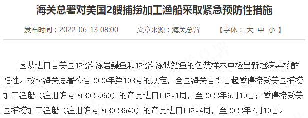 因从进口自美国1批次冻岩鲽鱼和1批次冻狭鳕鱼的包装样本中检出新冠病毒核酸阳性。按照海关总署公告2020年第103号的规定,全国海关自即日起暂停接受美国捕捞加工渔船(注册编号为3025960)的产品进口申报1周,至2022年6月19日;暂停接受美国捕捞加工渔船(注册编号为3023640)的产品进口申报4周,至2022年7月10日。
