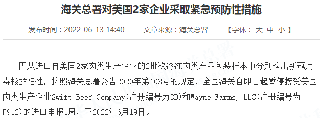 因从进口自美国2家肉类生产企业的2批次冷冻肉类产品包装样本中分别检出新冠病毒核酸阳性,按照海关总署公告2020年第103号的规定,全国海关自即日起暂停接受美国肉类生产企业Swift Beef Company(注册编号为3D)和Wayne Farms, LLC(注册编号为P912)的进口申报1周,至2022年6月19日。