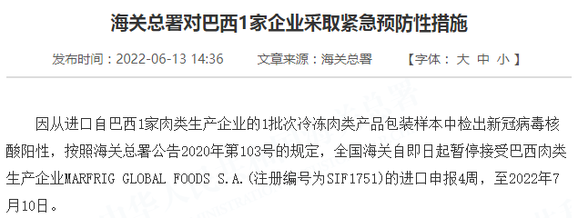 因从进口自巴西1家肉类生产企业的1批次冷冻肉类产品包装样本中检出新冠病毒核酸阳性,按照海关总署公告2020年第103号的规定,全国海关自即日起暂停接受巴西肉类生产企业MARFRIG GLOBAL FOODS S.A.(注册编号为SIF1751)的进口申报4周,至2022年7月10日。