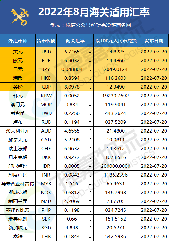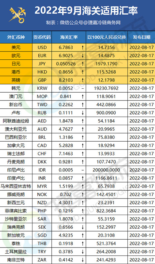 根据《中华人民共和国海关进出口货物征税管理办法》(海关总署令2005年第124号)第十六条的规定,海关每月使用的计征汇率为上一个月第三个星期三(第三个星期三为法定节假日的,顺延采用第四个星期三)中国人民银行公布的外币对人民币的基准汇率;