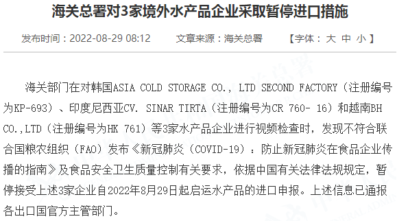 海关部门在对韩国ASIA COLD STORAGE CO., LTD SECOND FACTORY(注册编号为KP-693)、印度尼西亚CV. SINAR TIRTA(注册编号为CR 760- 16)和越南BH CO.,LTD(注册编号为HK 761)等3家水产品企业进行视频检查时,发现不符合联合国粮农组织(FAO)发布《新冠肺炎(COVID-19):防止新冠肺炎在食品企业传播的指南》及食品安全卫生质量控制有关要求,依据中国有关法律法规规定,暂停接受上述3家企业自2022年8月29日起启运水产品的进口申报。上述信息已通报各出口国官方主管部门。