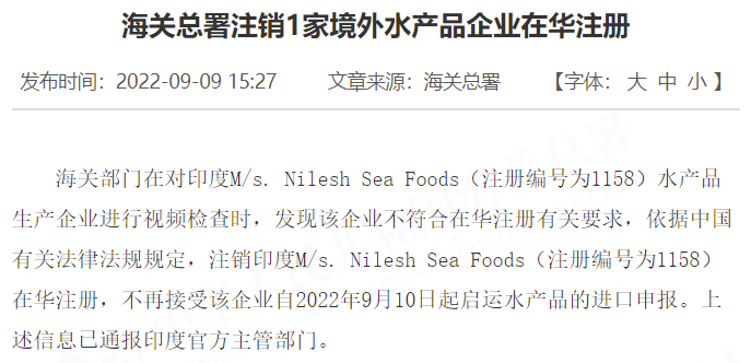 海关部门在对印度M/s. Nilesh Sea Foods(注册编号为1158)水产品生产企业进行视频检查时,发现该企业不符合在华注册有关要求,依据中国有关法律法规规定,注销印度M/s. Nilesh Sea Foods(注册编号为1158)在华注册,不再接受该企业自2022年9月10日起启运水产品的进口申报。上述信息已通报印度官方主管部门。