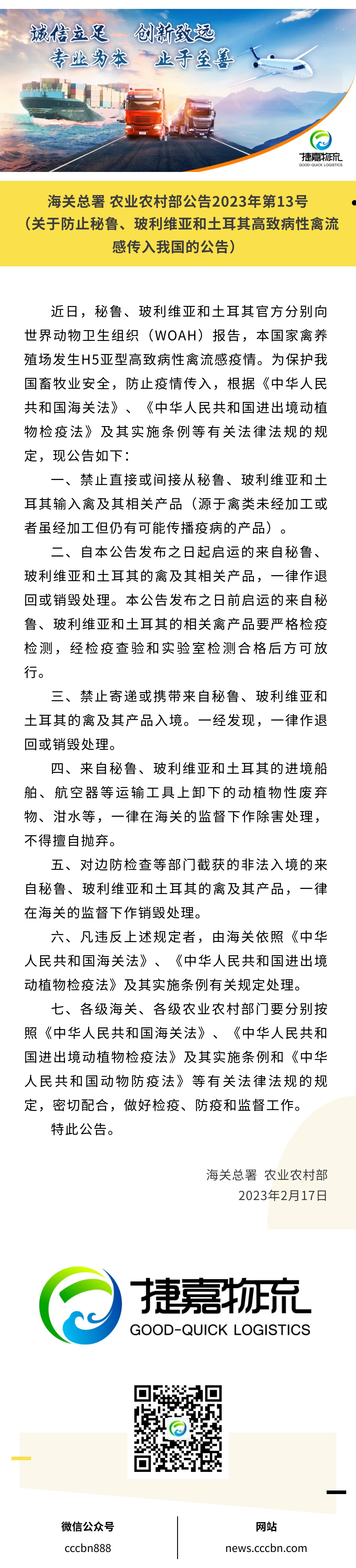 海关总署 | 关于防止秘鲁、玻利维亚和土耳其高致病性禽流感传入我国的公告